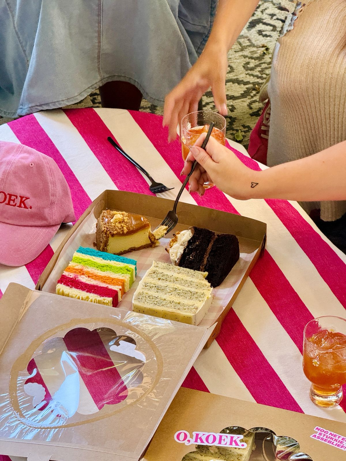 Meet the O,KOEK. Box our signature cake box packed with four beautiful slices from different bakers, all together in one cute picnic-style box.